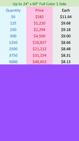 We show only the most efficient sizes for 48x96" and 60x120" master sheets. Any size is available. We also show number of signs at a price break number of full sheets (10 full sheets, 25 full sheets, 50 full sheets, ...).